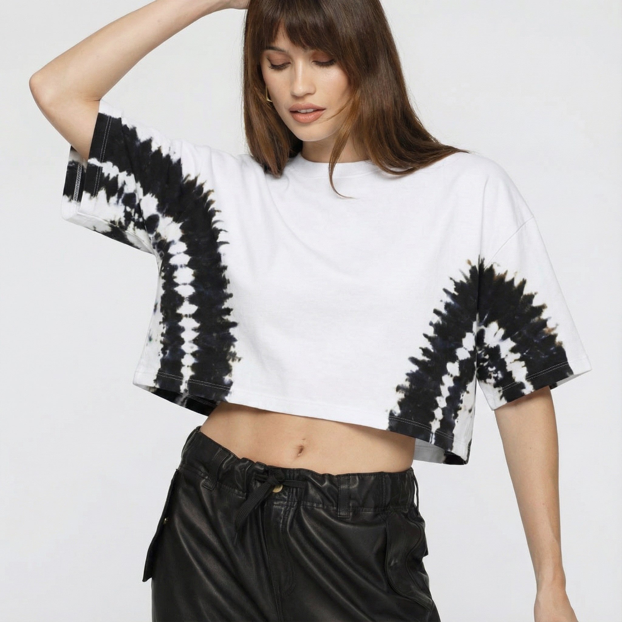 The 'Rocky Rafaela Tye Dye Evolution Tee' is made from high quality 100% combed cotton. Its a slightly thicker cotton creating more of a structured high end tee. Our tye dye effect is very carefully hand dyed to create this 3 colour dye effect around the body and sleeve. This work is intricate and needs patience and love to produce this technique. Model wears size L.