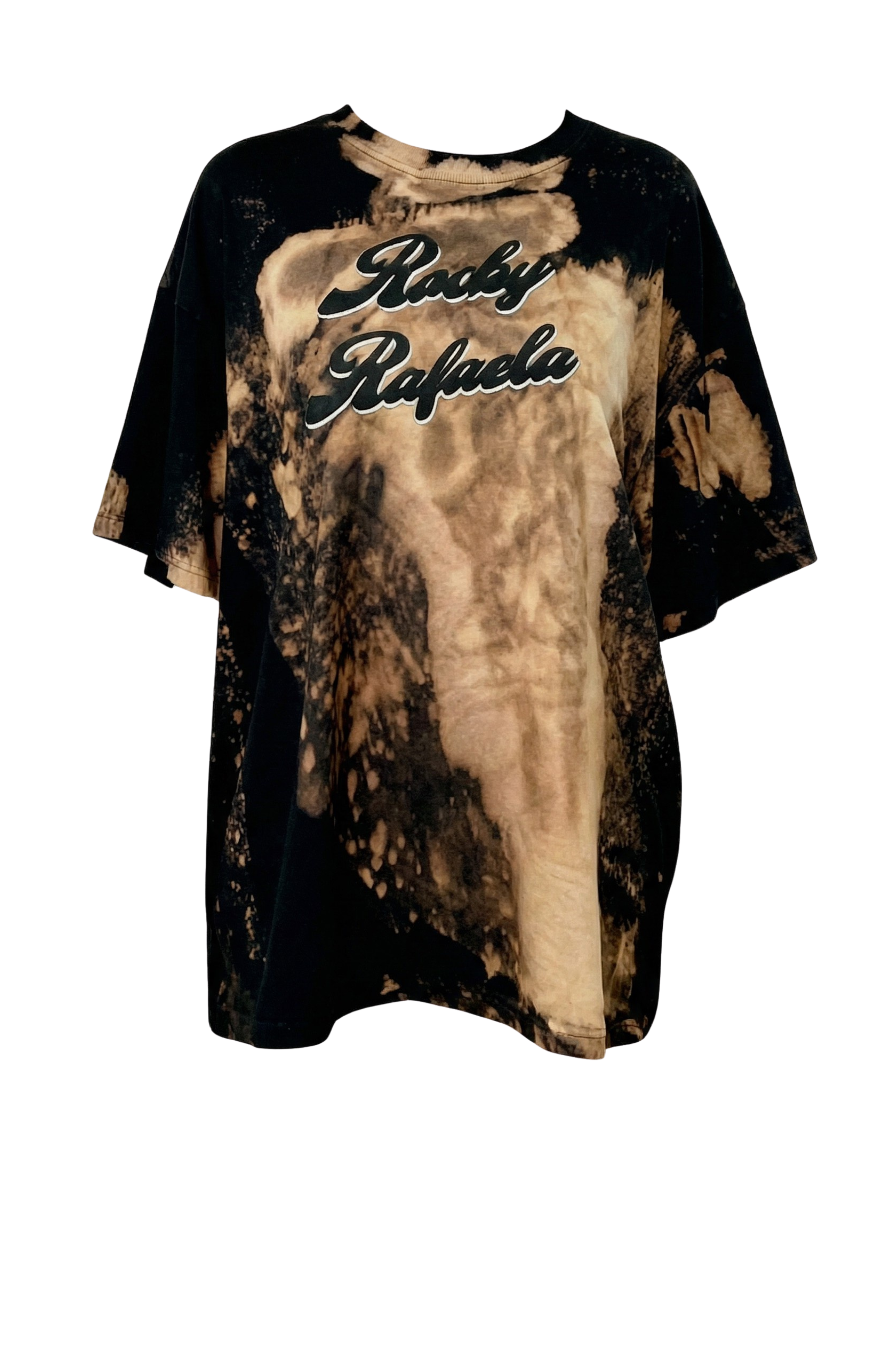 The 'Rocky Rafaela Raised Logo Tee' is made from organic lightweight cotton. The material is lightweight and silky soft. The cut is oversized and finished with a bubble raised RR logo on the back. The logo has 2 colours, white and black created a 3D effect. For the ultimate RR look wear styled with our leather mini and statement heel. This tee has been hand dyed by mixing certain dyes and bleaches to create this space pattern. Logo is at the back of the tee.