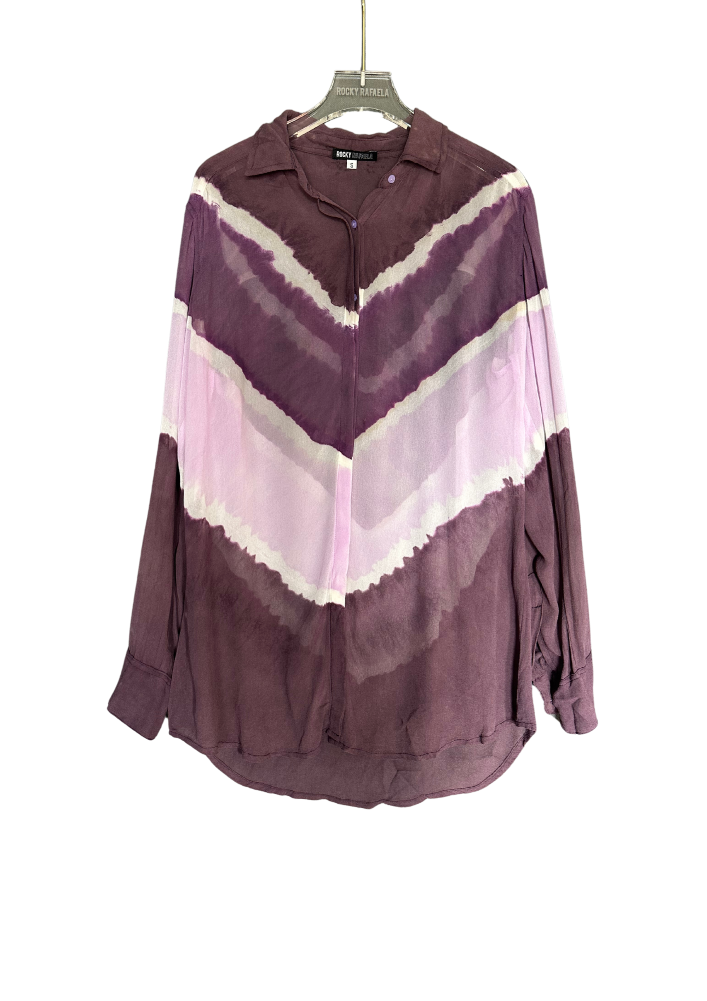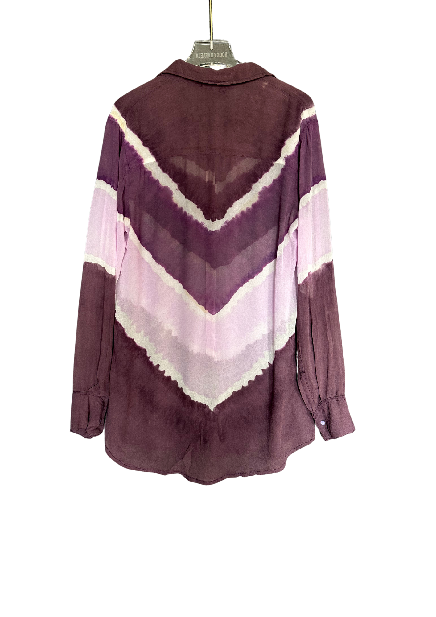 The Wonderwoman shirt features hand dying techniques to produce diagonal tye dye print. The material is 100% silk chiffon. The material is light weight and sheer. This is the perfect shirt to wear from day to night.
