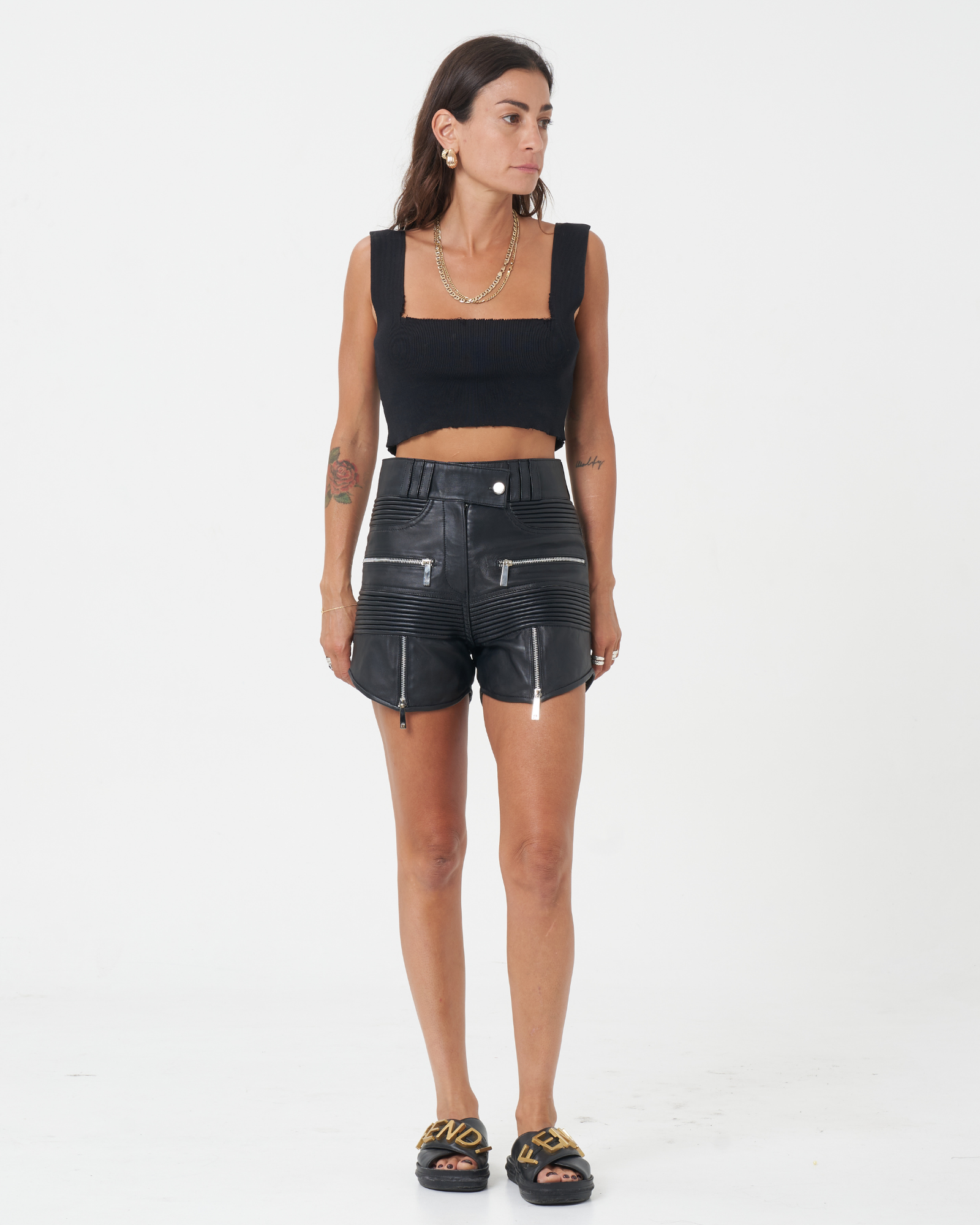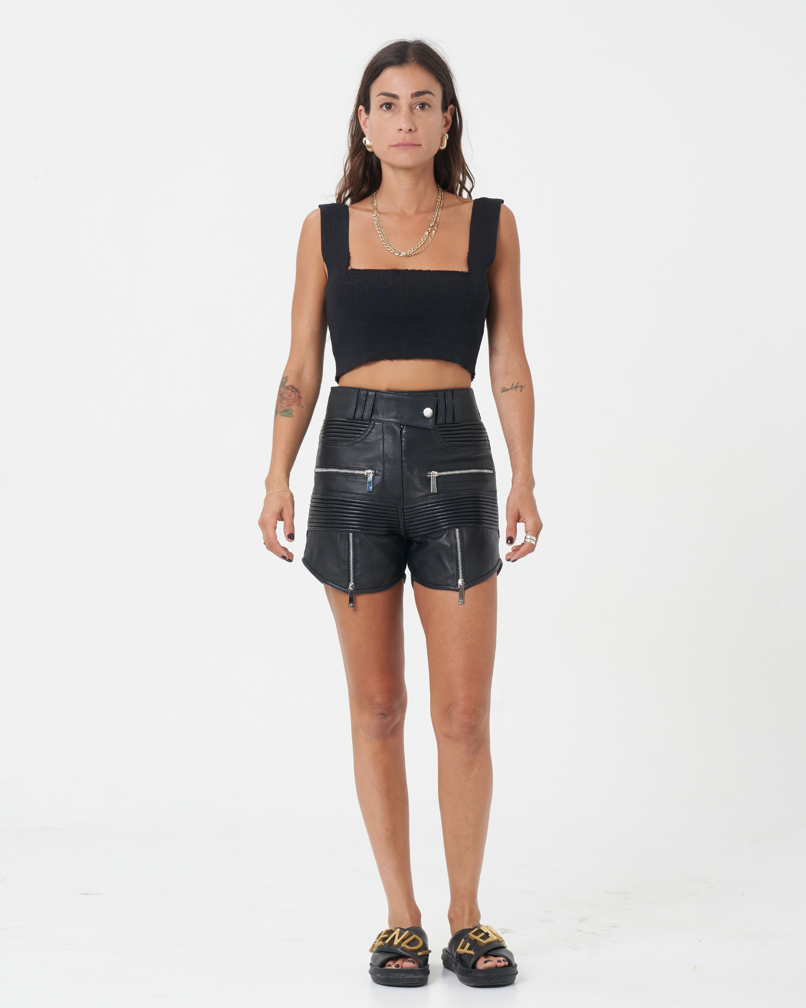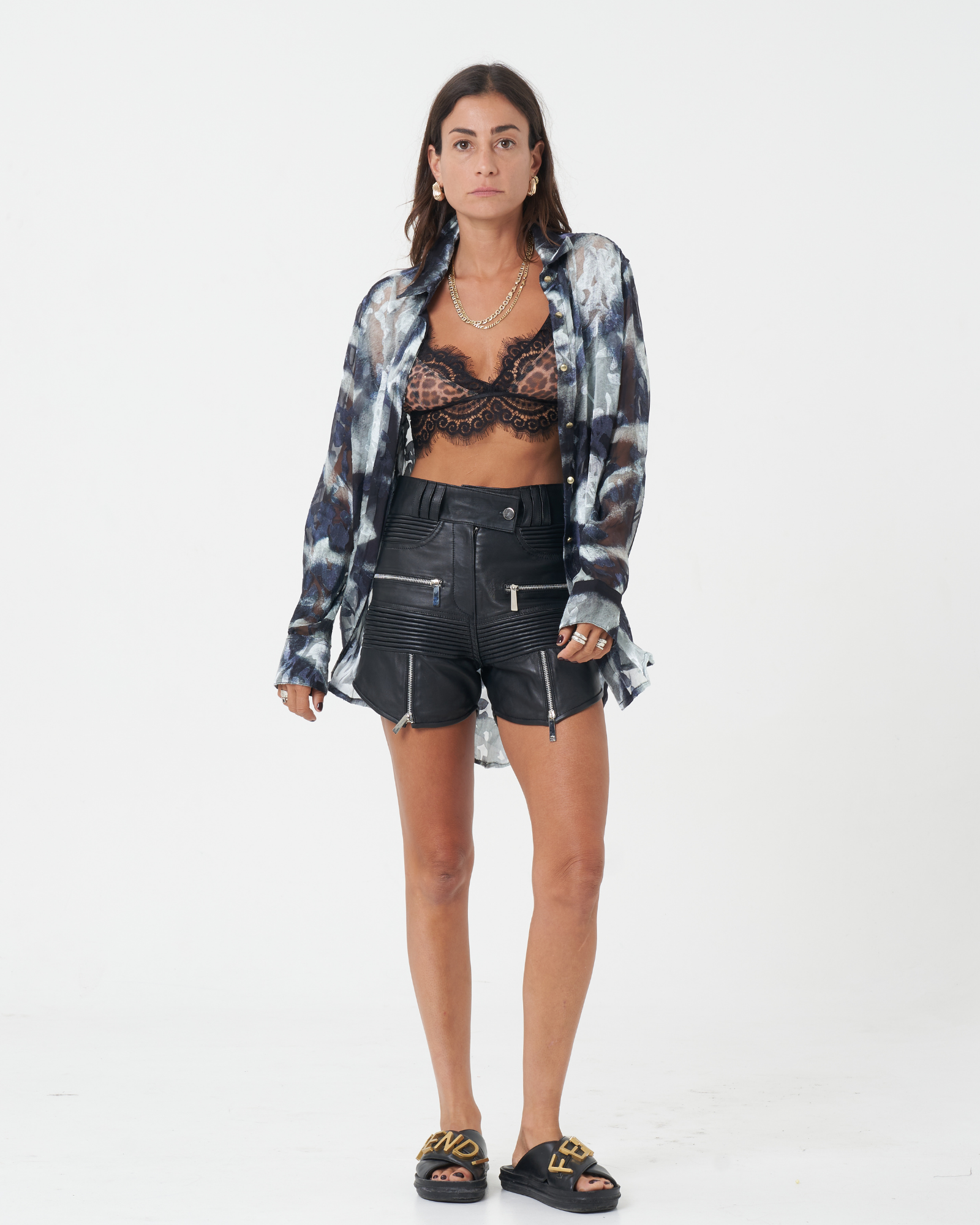 The length sits stylishly between short and longer shorts, offering a flattering and versatile silhouette. These edgy shorts pair effortlessly with the brand’s lace bralettes and silk shirts, creating a feminine yet bold look that balances elegance with attitude.
