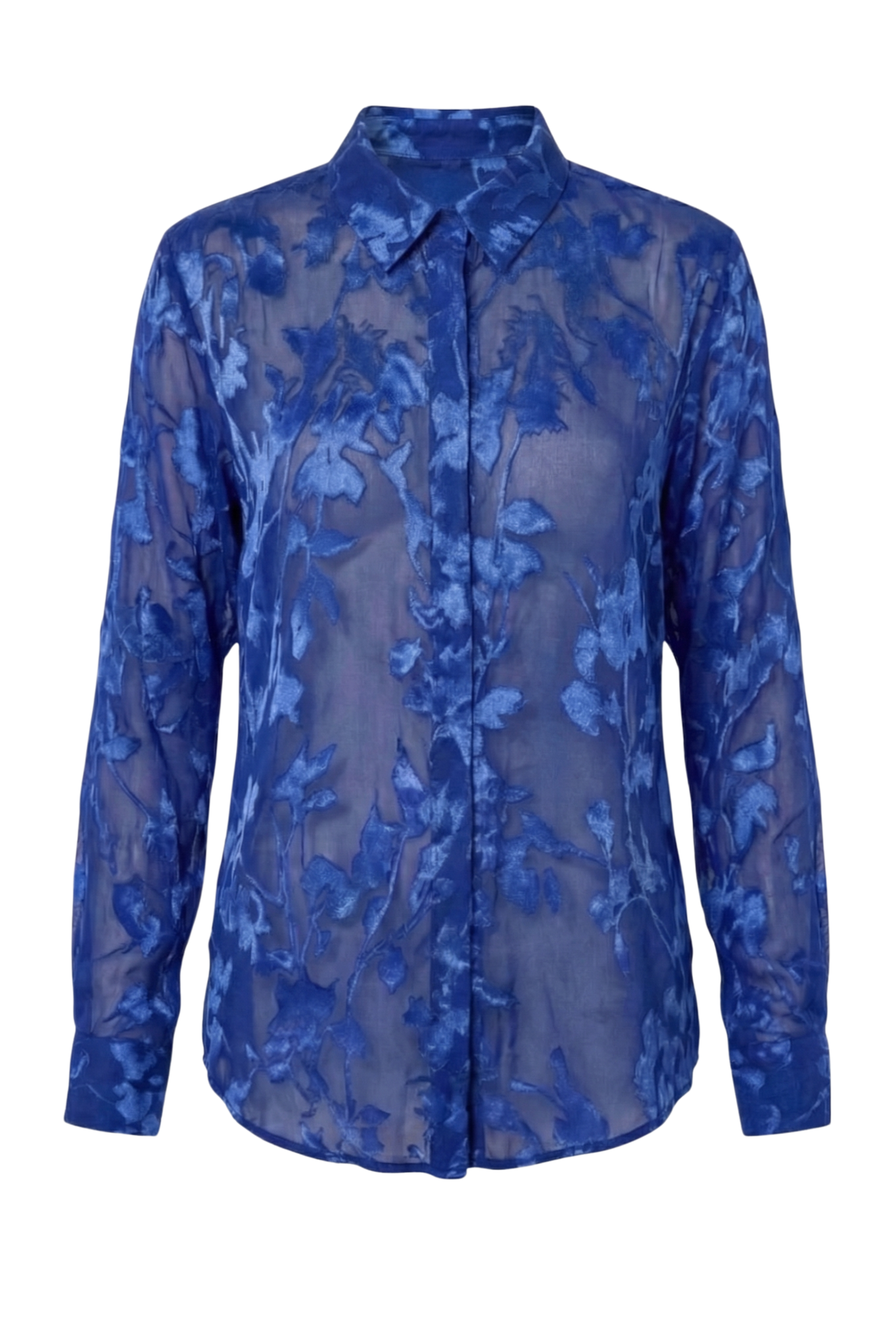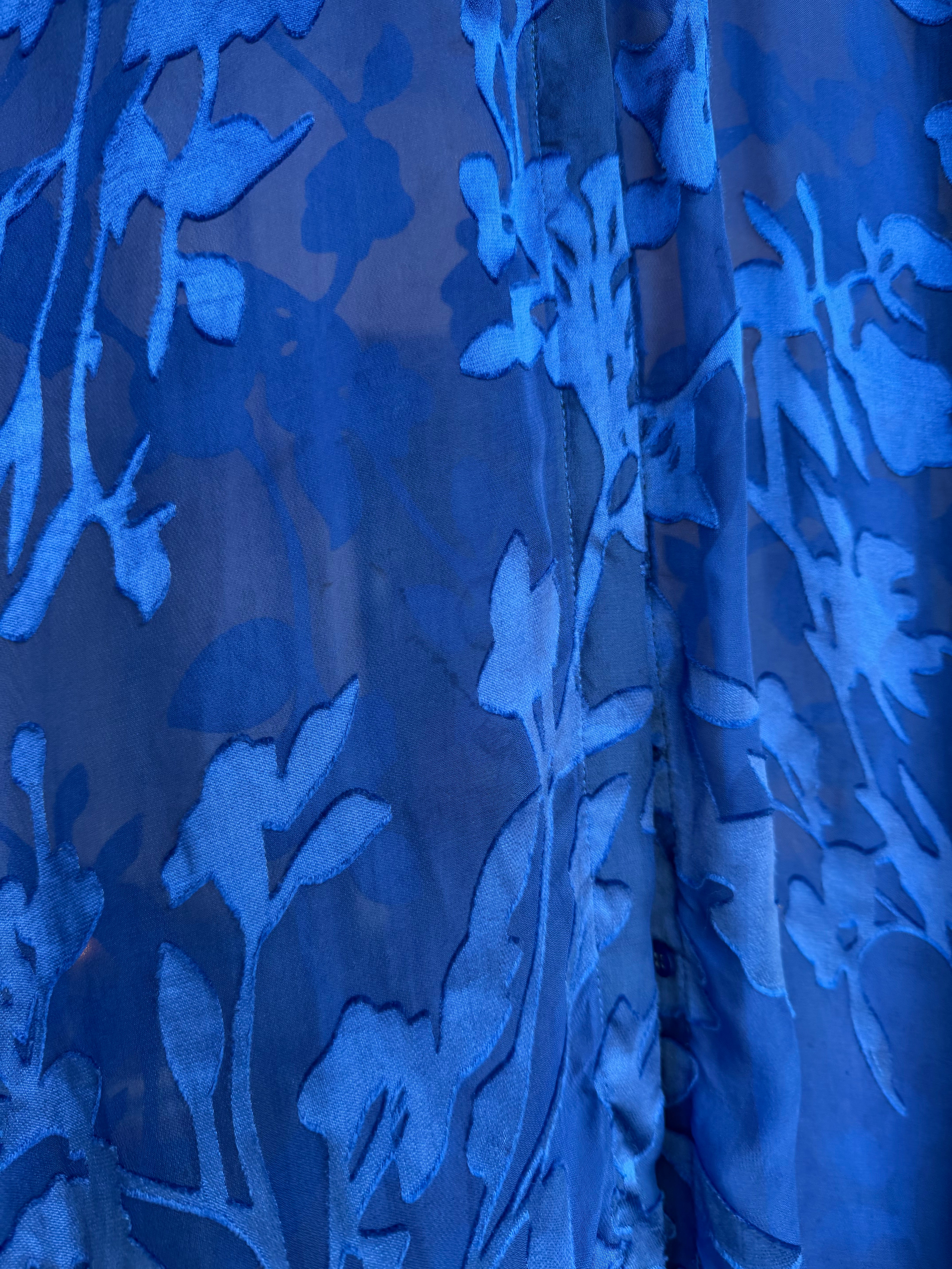 Hand-cut satin florals pressed onto pure 100% silk chiffon — no two pieces identical. This is not a shirt you wear once. It’s the piece that gets asked about every time you put it on.Lightweight enough to move like a second skin. Structured enough to mean business. The sheer silhouette catches light the way nothing else in your wardrobe does.