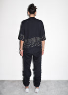 Custom eyelets are mapped across the front, back, and sleeves, forming a bold, sculptural pattern that reveals a hidden design within the metalwork itself. Every placement is deliberate — creating dimension, attitude, and energy.