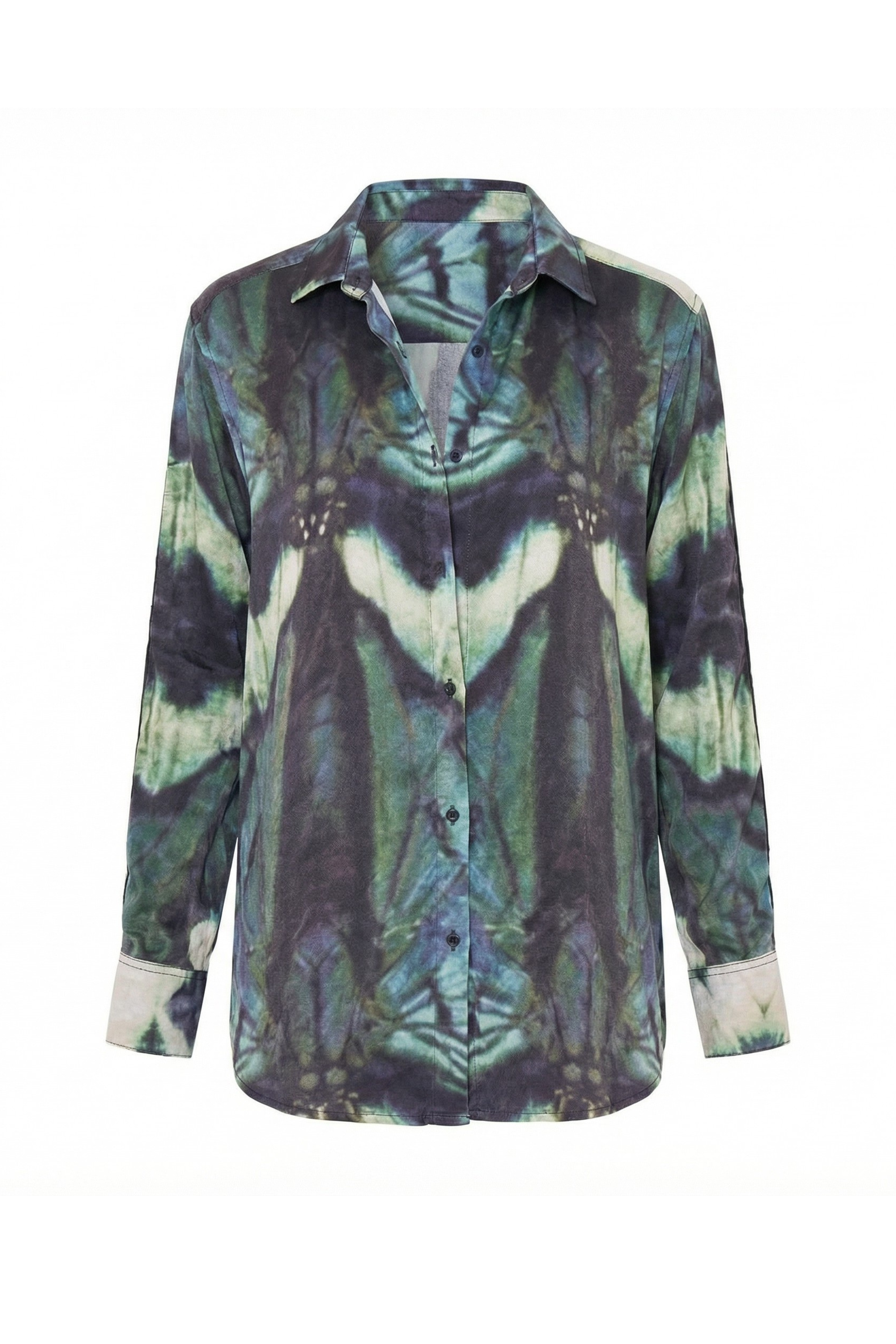 The shirt features a loose fit for a relaxed yet polished look, complemented by invisible buttons at the center front, maintaining a clean and seamless aesthetic.